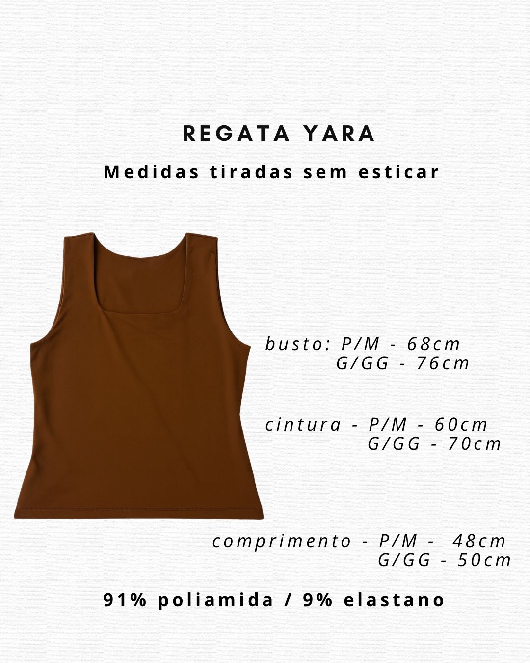 Descrição do produto: Regata Yara é a peça perfeita para compor seus looks no verão. Ela combina com uma infinidade de tecidos e vai te deixar livre e segura.